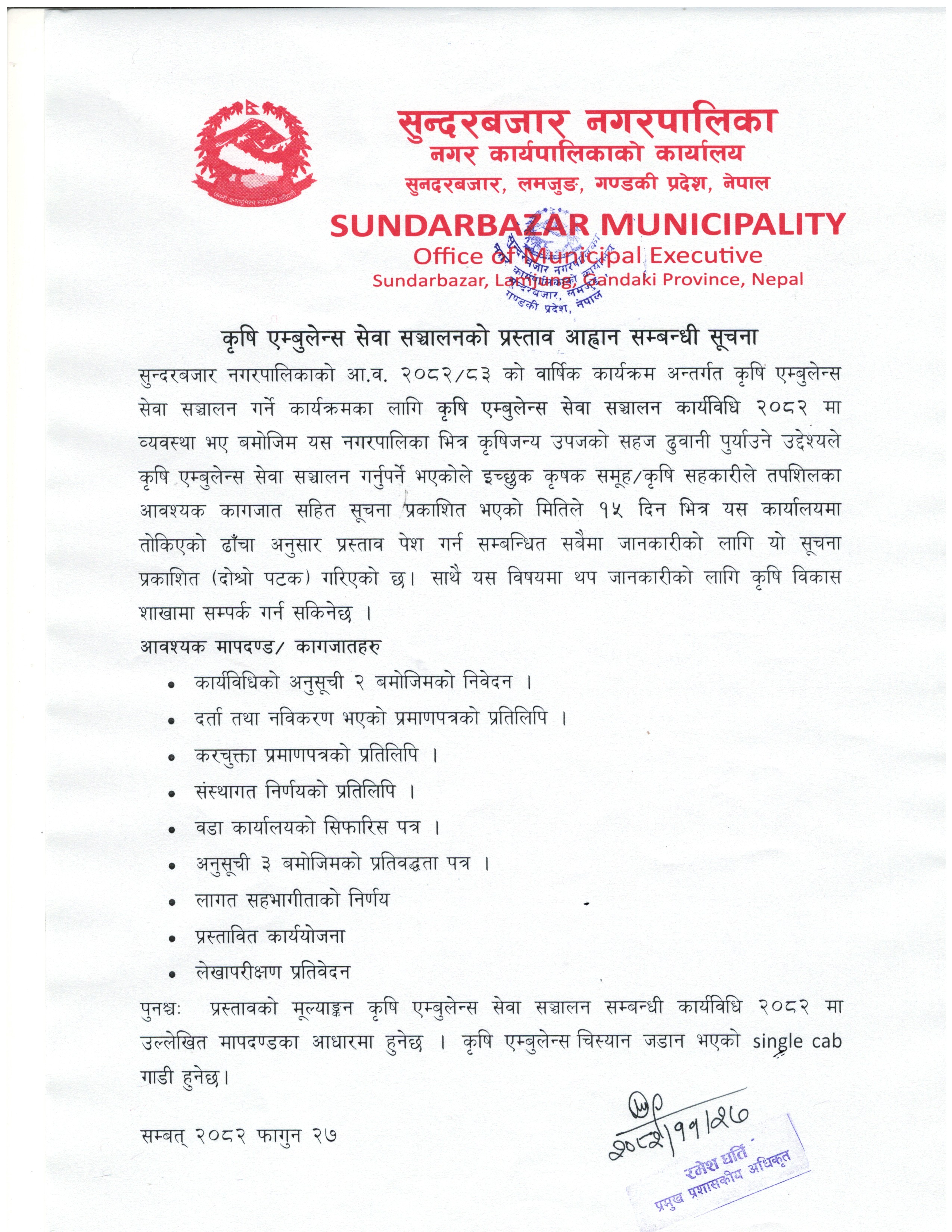 कृषि एम्बुलेन्स सेवा सञ्चालनको प्रस्ताव आह्वान सम्बन्धी सूचना (दाेस्रो पटक)