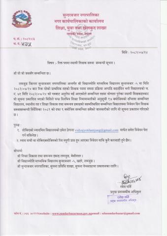 सुन्दरबजार नगरपालिकाद्वारा संचालित शैक्षिक सत्र २०८१ को आधारभूत तह (कक्षा ८) उतिर्ण परीक्षाको नतिजा प्रकाशन गरिएको छ । विद्यार्थी तथा अभिभावकहरुले सम्बन्धित विध्यालयमा सम्पर्क राख्नु हुन अनुरोध छ ।