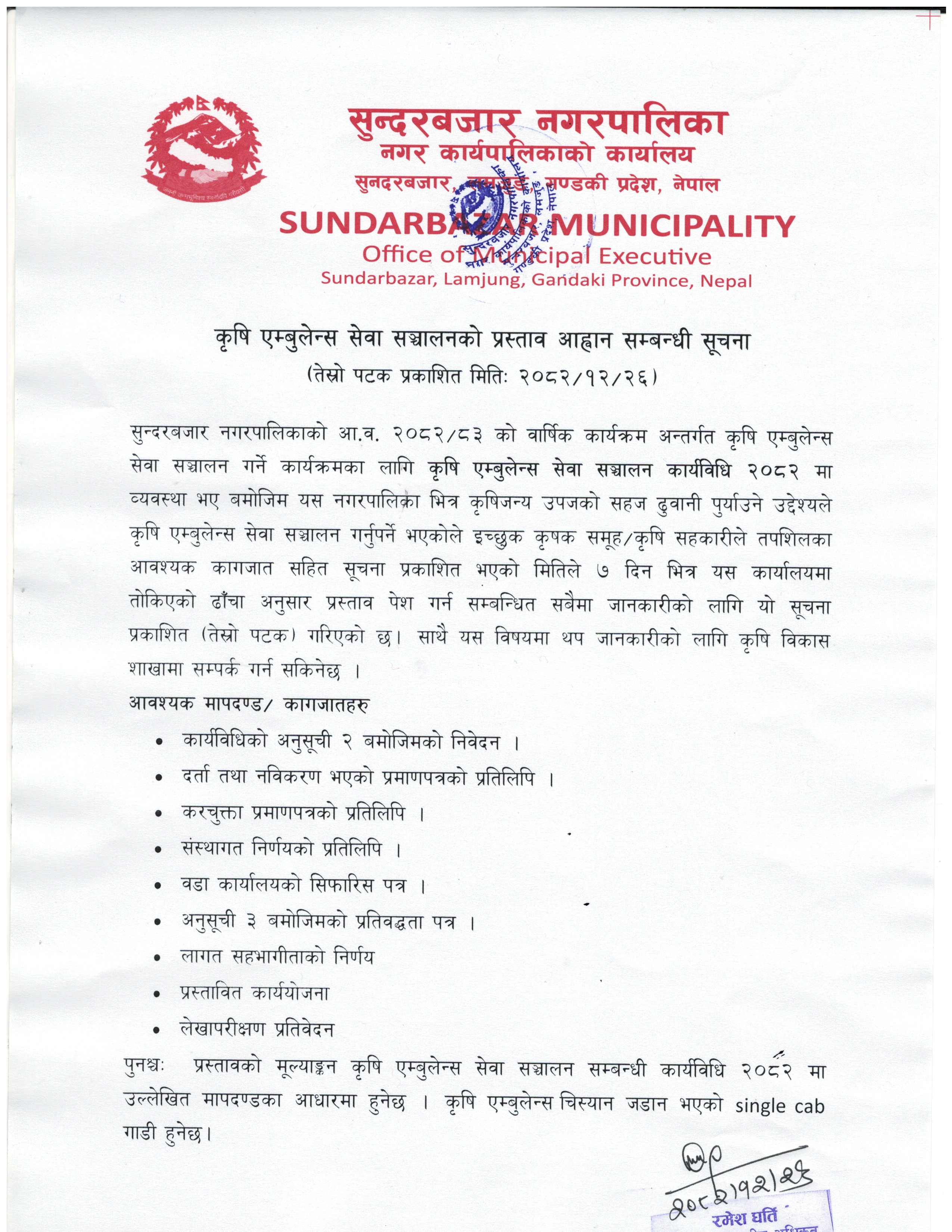 कृषि एम्बुलेन्स सेवा सञ्चालनको प्रस्ताव आह्वान सम्बन्धी सूचना (दाेस्रो पटक)