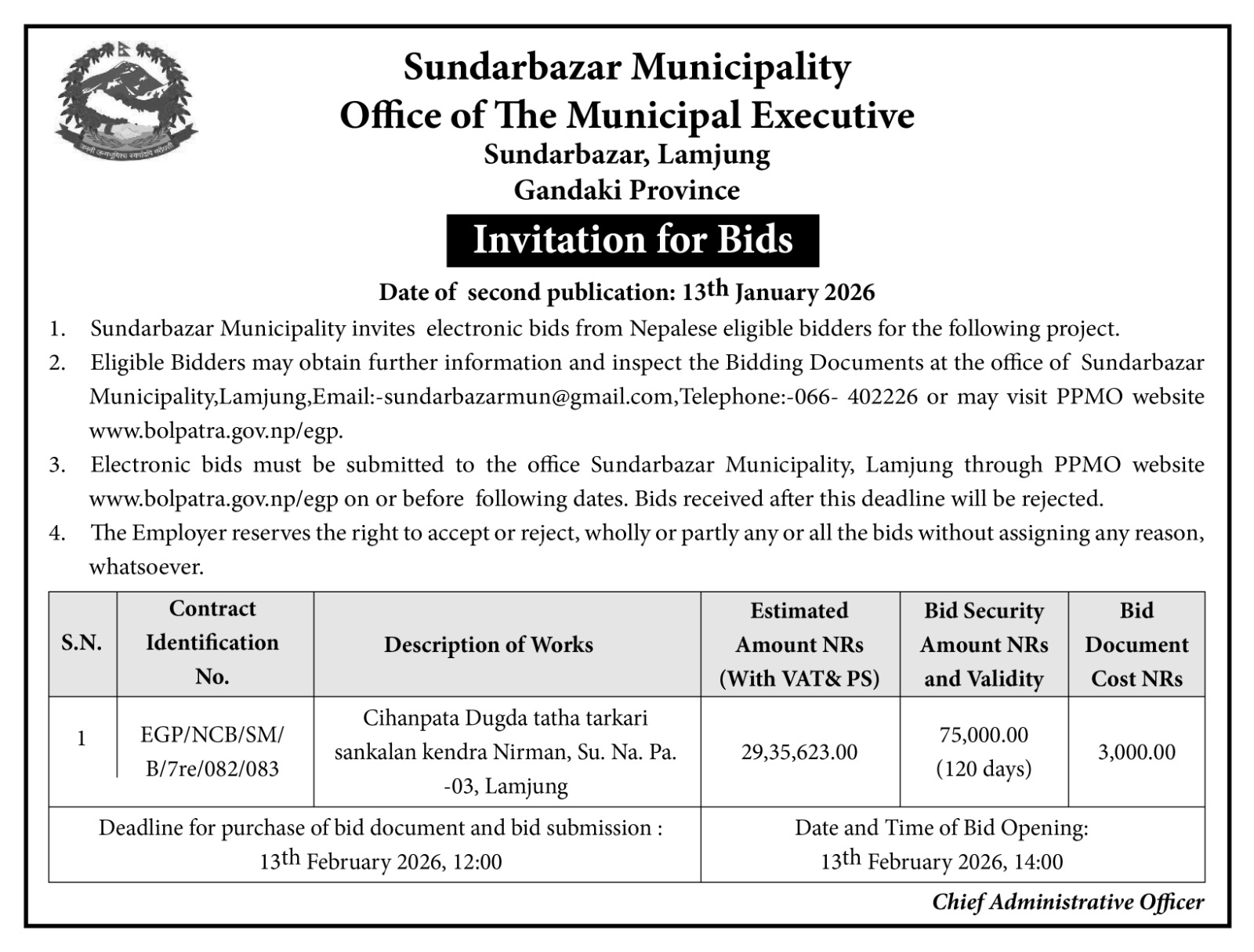 invitation for bids for construction of cihanpata dugda tatha tarakari sankalan kendra bhawan (2nd))