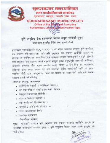 कृषि एम्बुलेन्स सेवा सञ्चालनको प्रस्ताव आह्वान सम्बन्धी सूचना (दाेस्रो पटक)