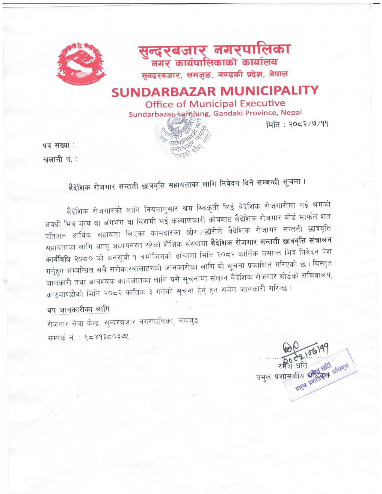 वैदेशिक रोजगार सन्तति छात्रवृत्ति सहायताका लागि निवेदन दिने सम्बन्धी सुचना