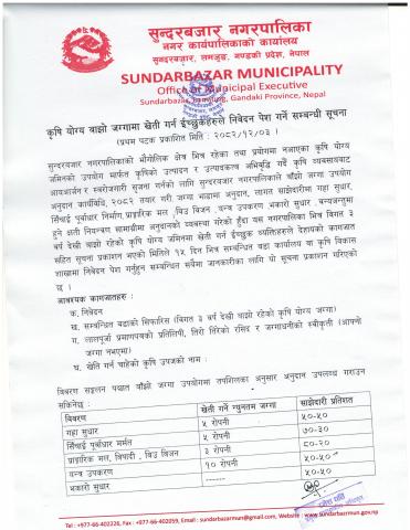 कृषि योग्य बाझो जग्गामा खेती गर्न ईच्छुकहरुले निवेदन पेश गर्ने सम्बन्धी सूचना